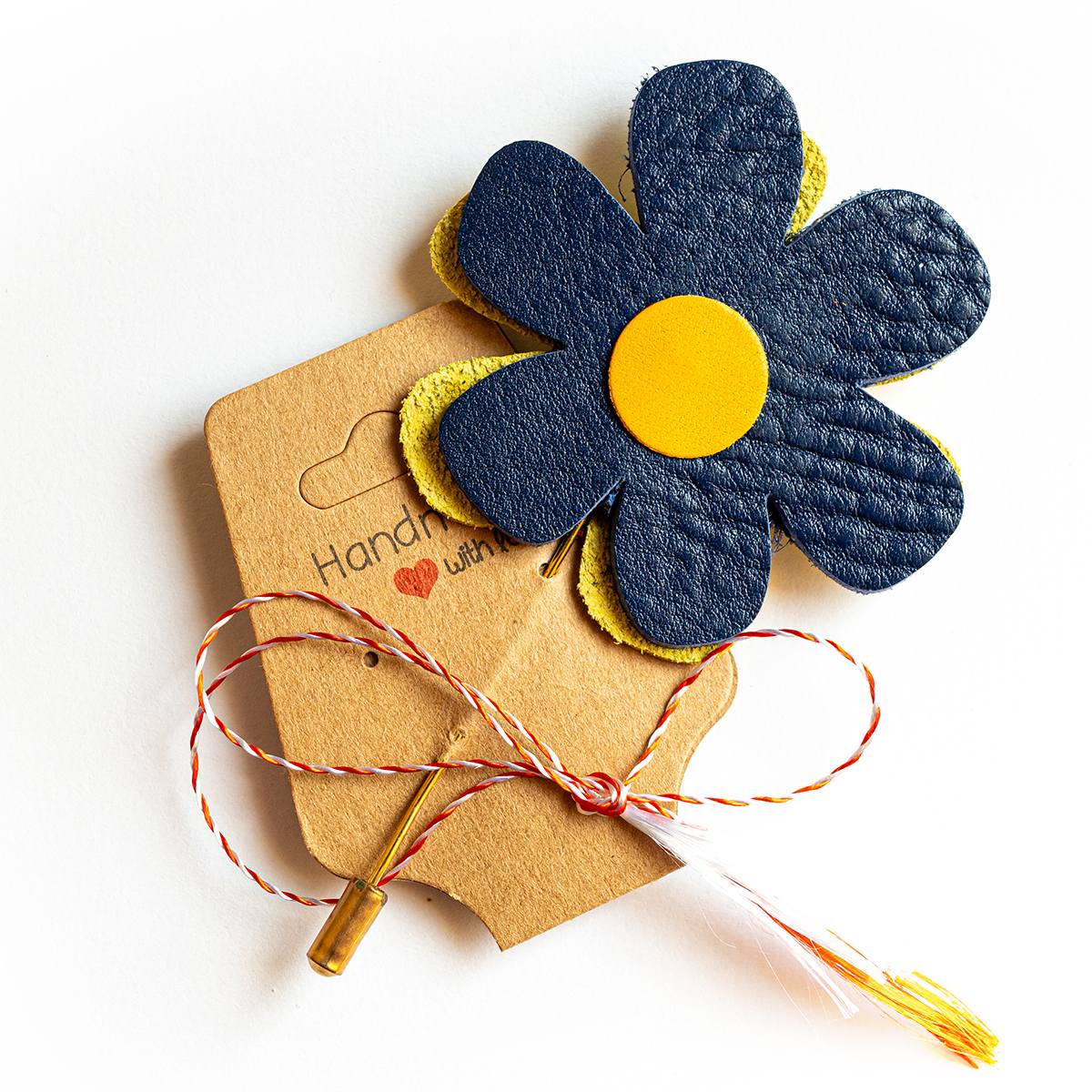 Brosa floare din piele naturala, realizata handamade, cu ac de brosa auriu; in nuante de albastru si galben.