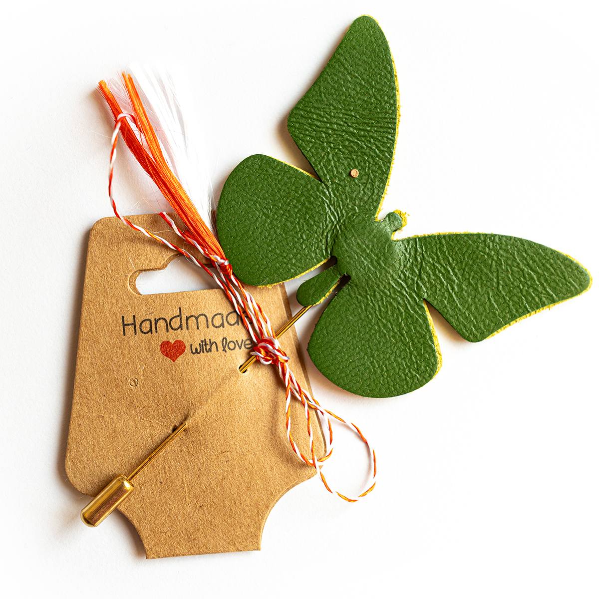 Brosa fluture din piele naturala, realizata handamade, cu ac de brosa auriu; in nuante de verde. Bijuteria are 2 fete, una verde si una galbena.